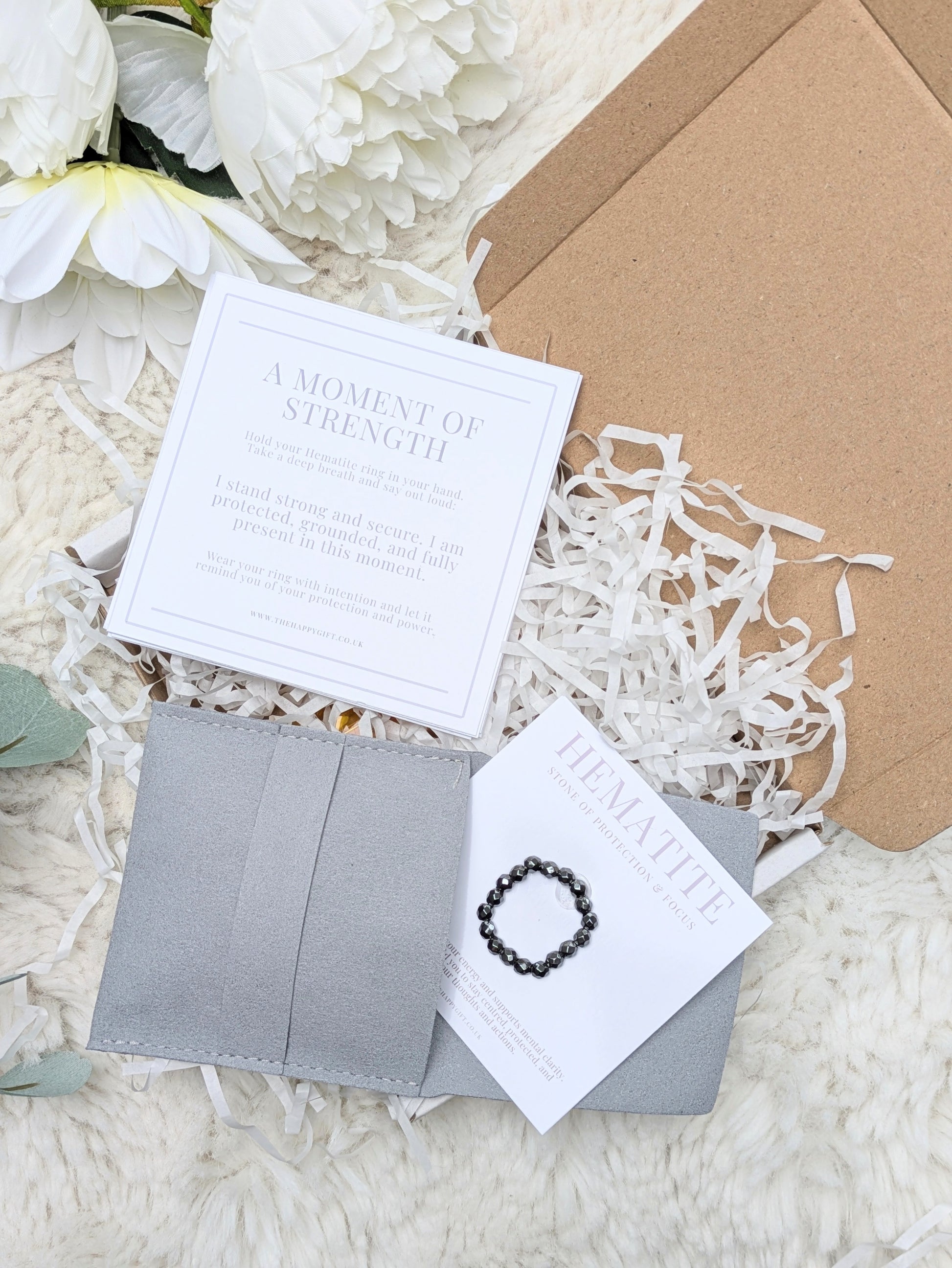 Each elasticated ring fits most finger sizes and comes with a crystal property card, a mini affirmation card, and a faux suede pouch to keep it protected — ready to wear or give as a mindful gift.