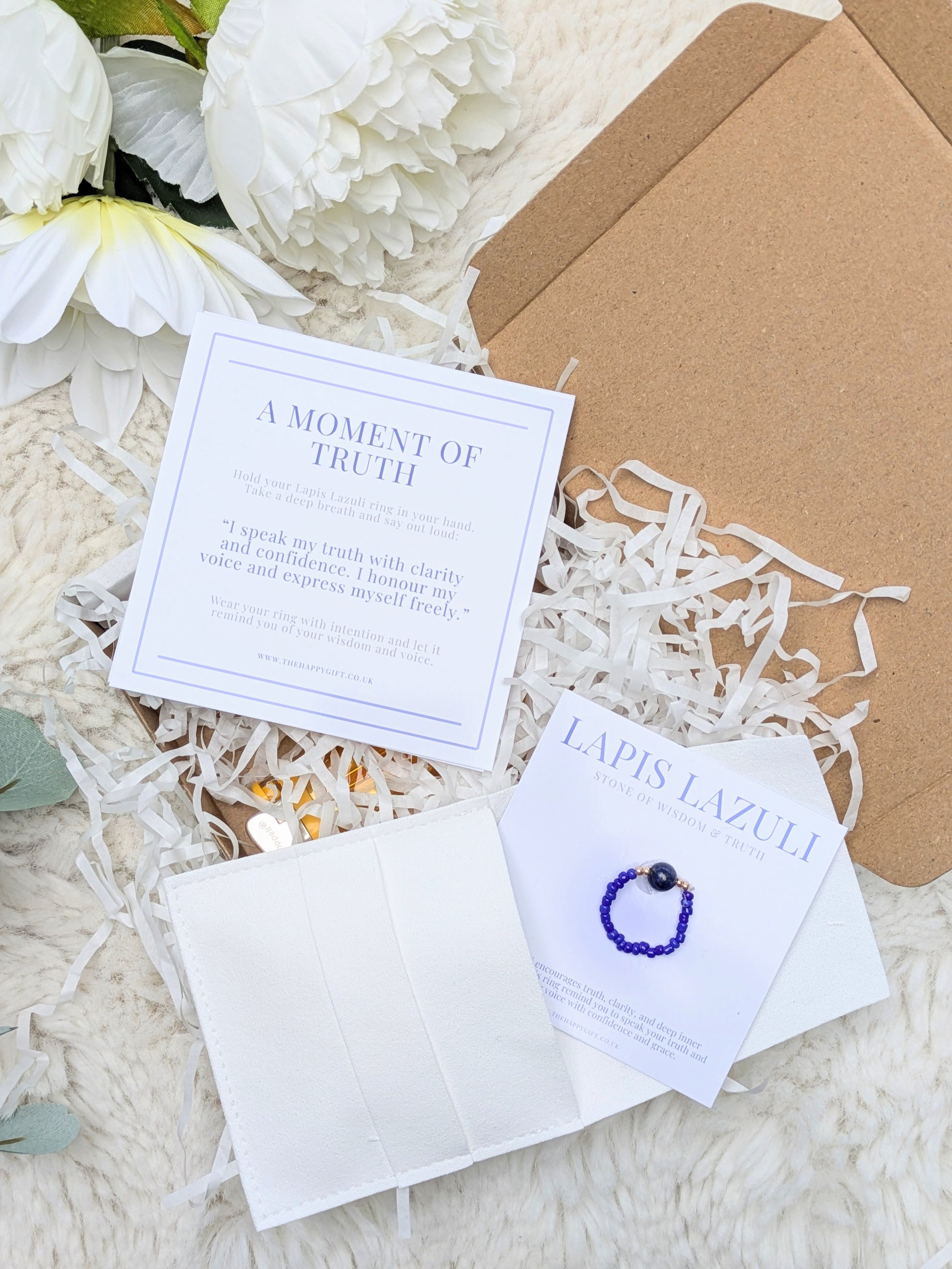 Our Lapis Lazuli Crystal Ring helps you speak your truth with confidence. This striking deep-blue stone is associated with wisdom, clarity, and self-expression.