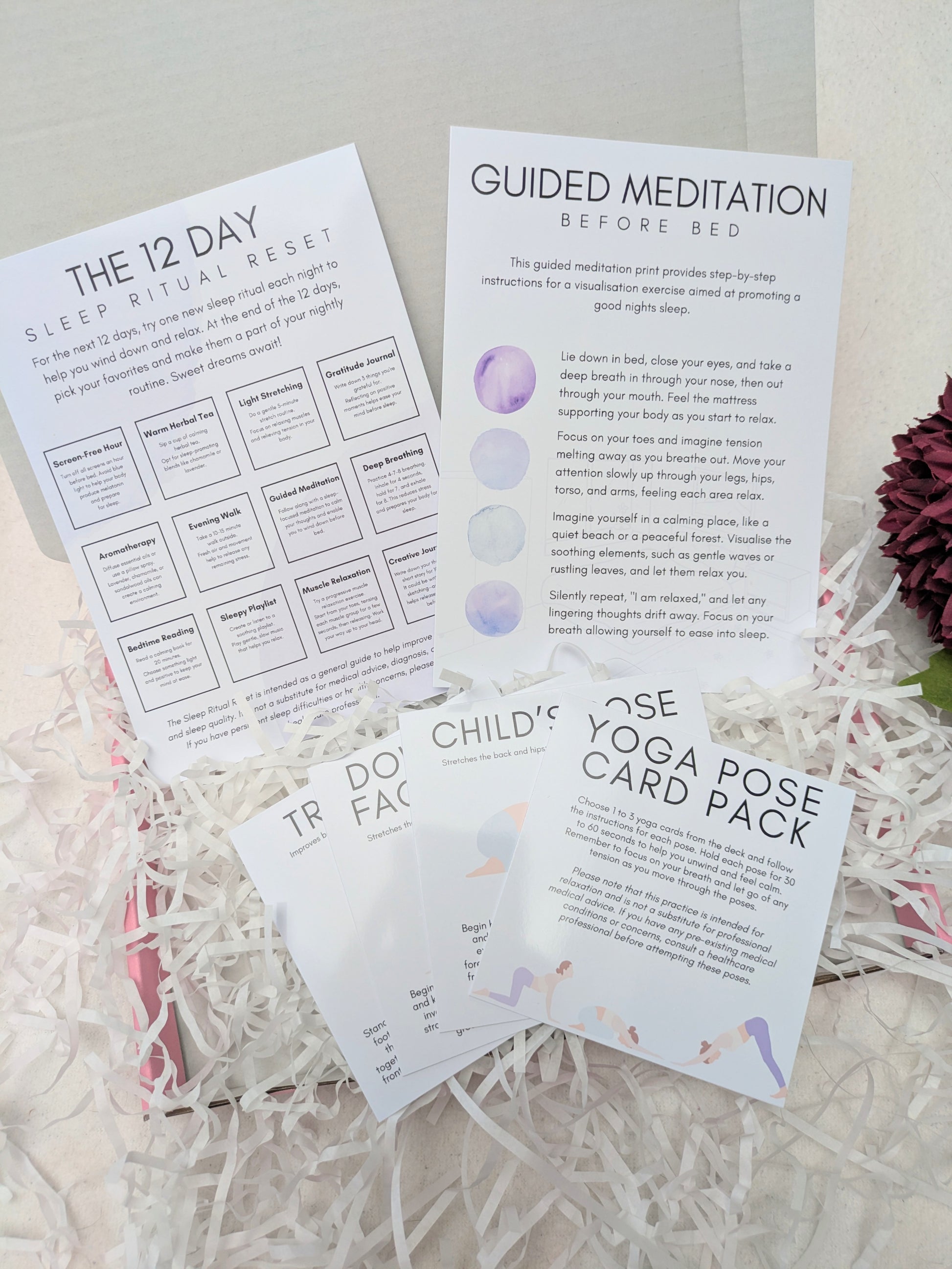 A Yoga Pose Pack, featuring 5 cards each with a different Yoga Pose - suitable for beginners. We recommend picking 2-3 to do each night to stretch your body and release any tension.