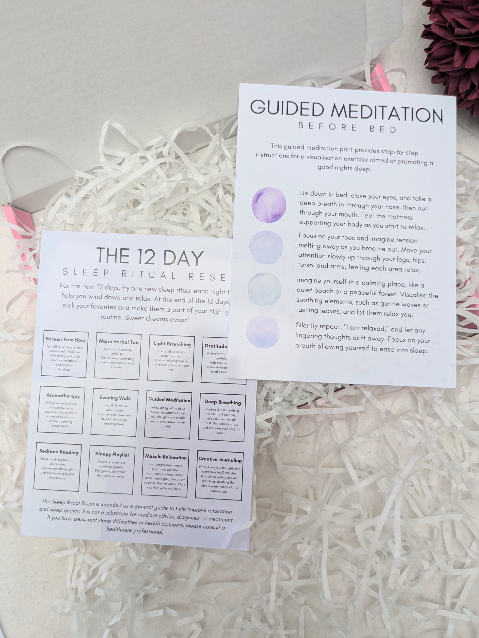 A 12 Day Sleep Rituals Print featuring 12 different rituals you can choose from each evening to help you to wind down and relax.