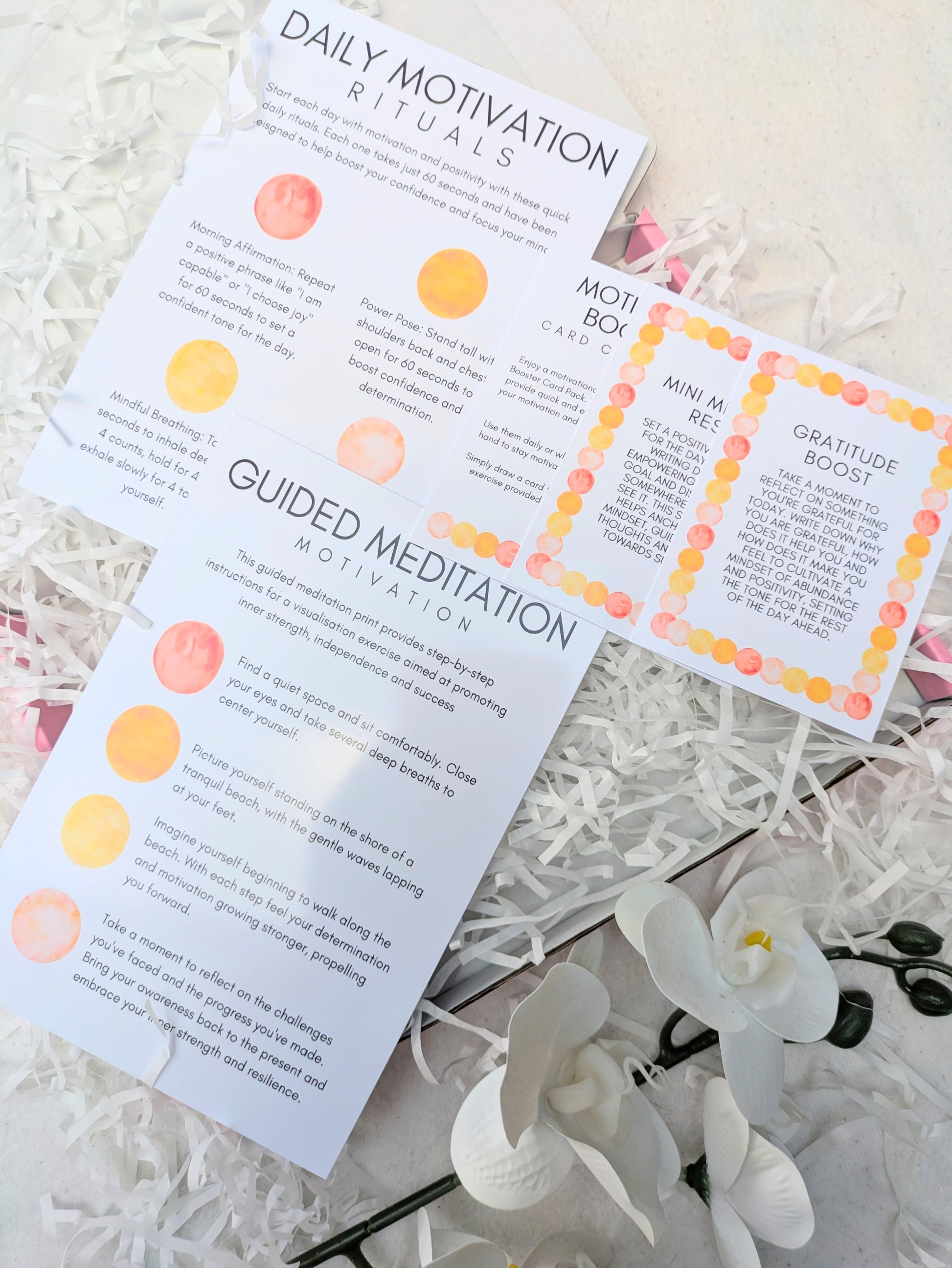 A Motivational Booster Card Pack, featuring 7 cards each with a different way you can boost your motivation. Use them when needed or pick a different card for each day.