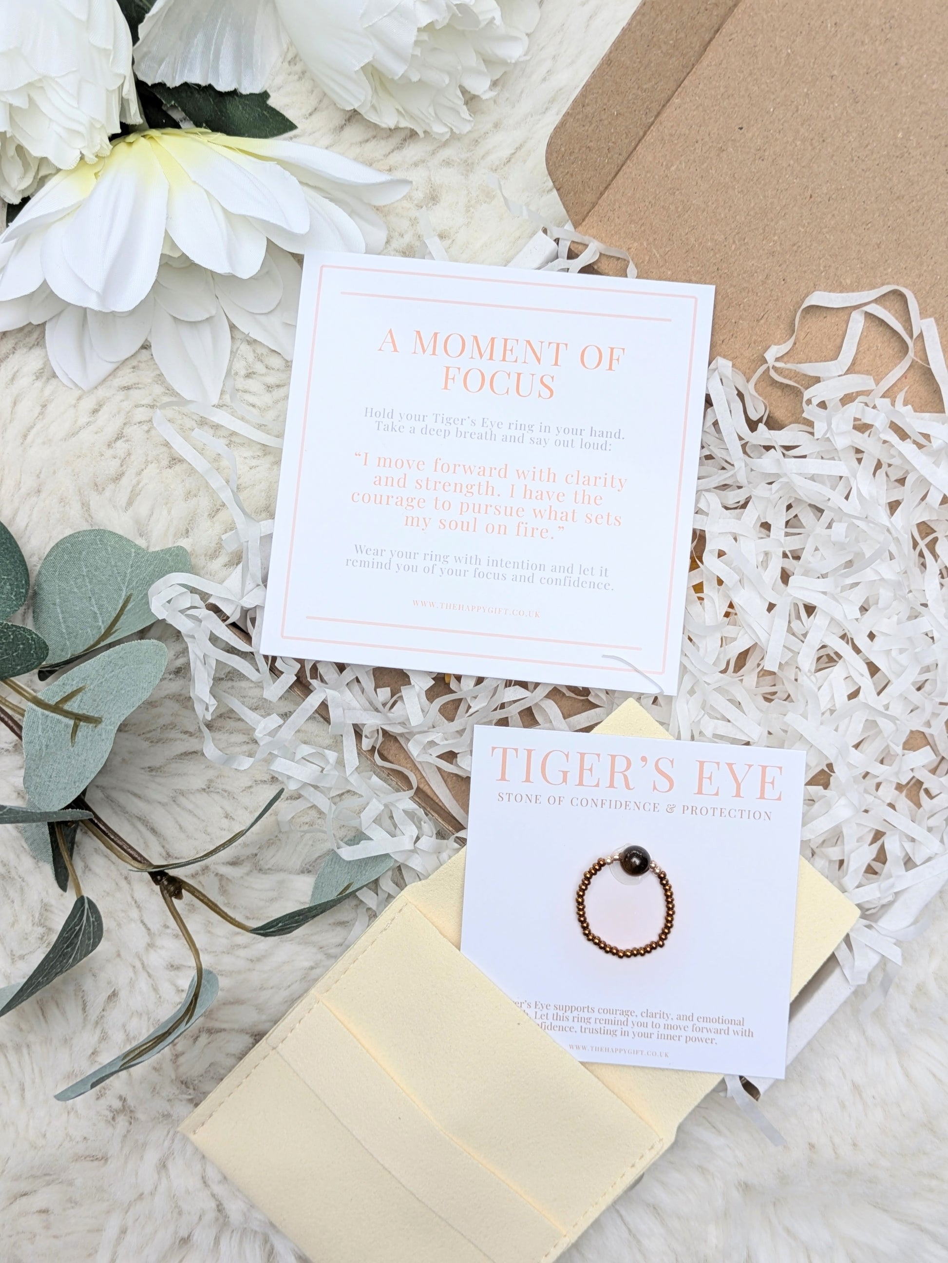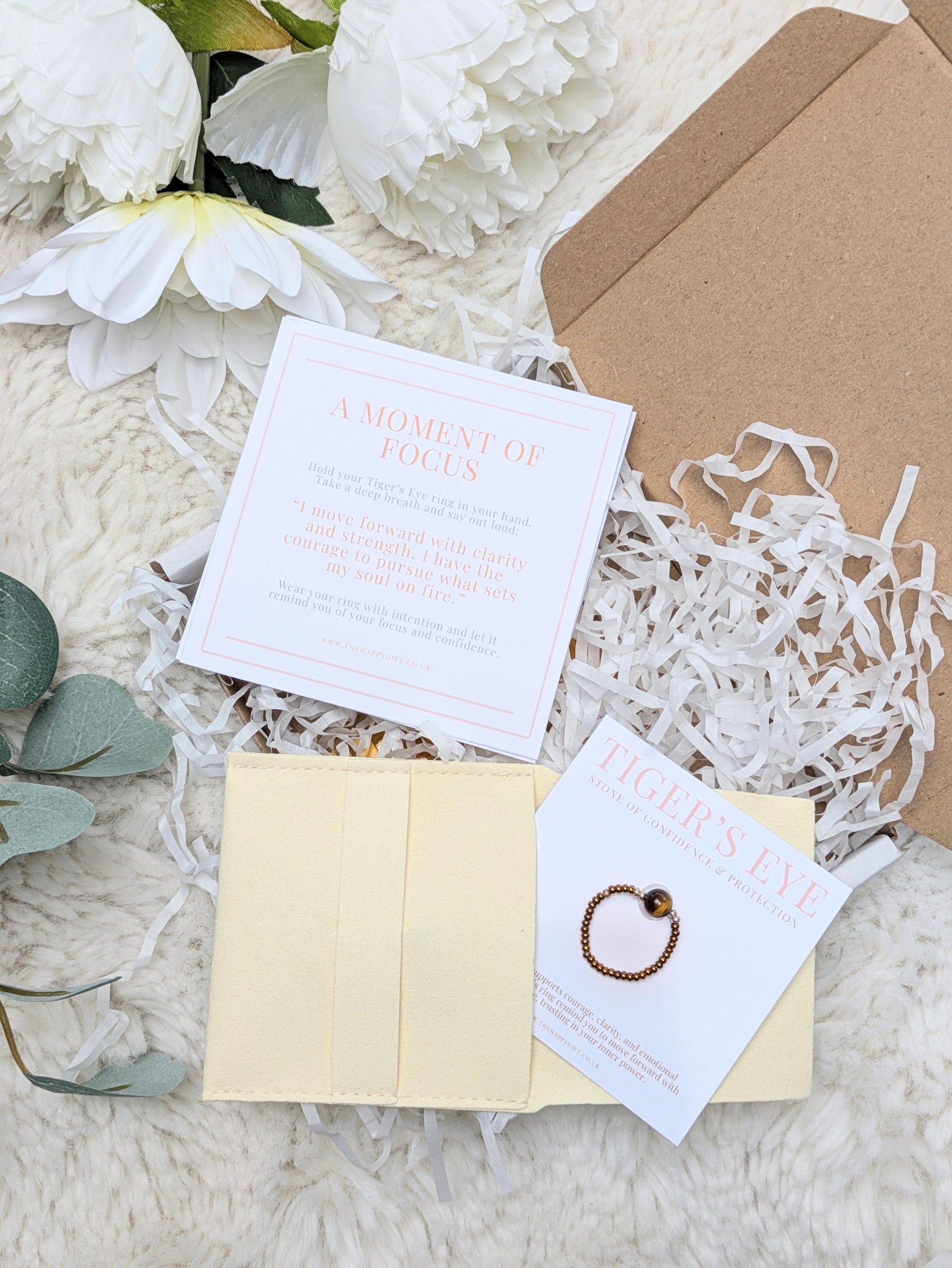 Each elasticated ring fits most finger sizes and comes mounted on a crystal property card, paired with a mini affirmation card for motivation, and presented in a soft faux suede pouch so it stays protected and ready to wear.